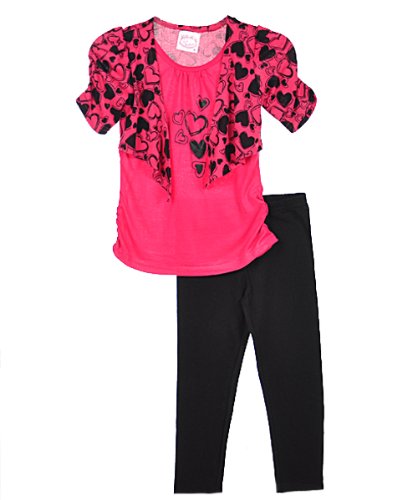 Sugah Honey "Flock, Add some sweetness to her wardrobe with this easy outfit by Sugah & Honey! The knit top has a mock bolero printed with hearts, ruching on the sleeves, gathering at the neckline, and hearts printed on the chest. The matching leggings are soft and stretchy. This look is ready for fun! Top 100% Polyester Leggings 95% Cotton, 5% Spandex Machine Wash Cold Made in China
